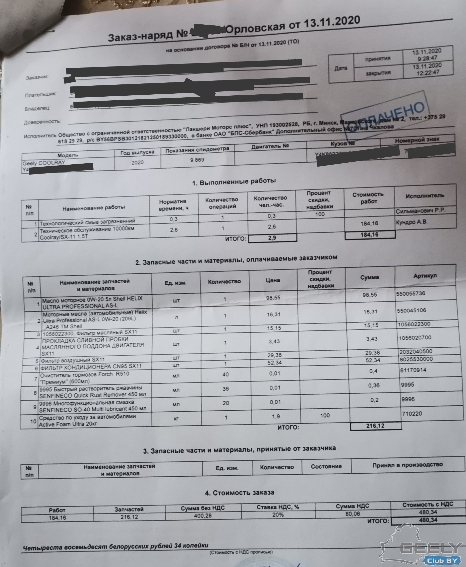 Стоимость регламентного технического обслуживания (ТО) Geely Coolray SX11 у официальных дилеров