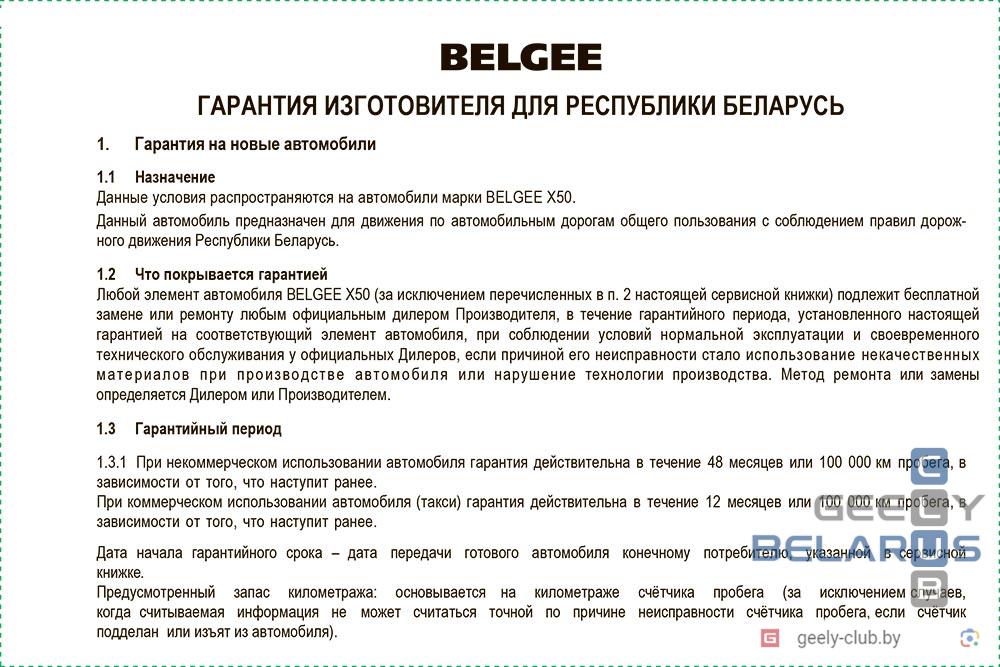 Сервисная книжка BELGEE X50 SX11 [PDF]. Гарантийные условия и регламент технического обслуживания (ТО)