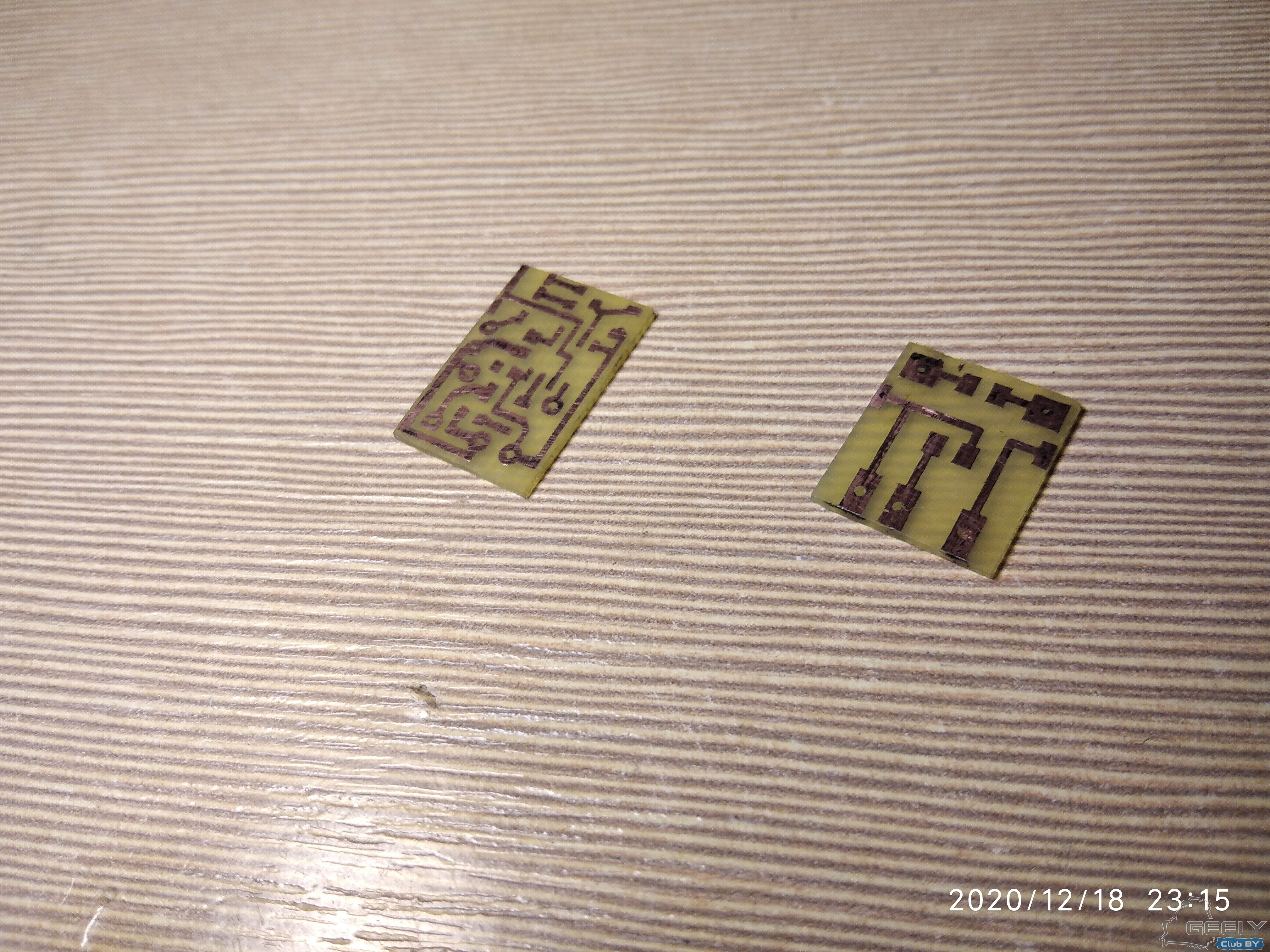 Немного повозился с разводкой и травлением. В процессе решил чуть переделать схему из статьи и добавить диодный мост на входе колодки реле, чтобы не заморачиваться с полярностью. Результат - две крохотные платы 21x14 и 16х14мм.