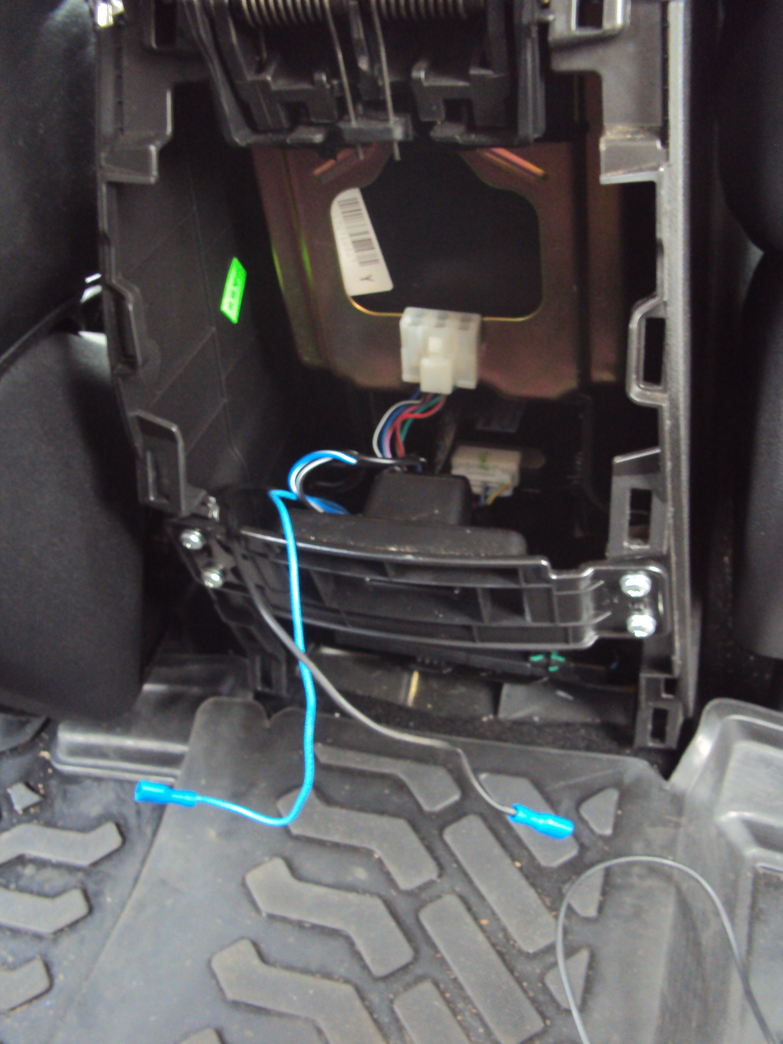 - Возвращаемся к передней панели, аккуратно закрепляем провод за жгут под рулевой колонкой, чтобы не болтался и потихоньку тащим его к центральной консоли. Там также ничего не разбирая подсовываем его под пластик, болтаться не будет, а пластик там жесткий и держит хорошо. Так и пихаем до тоннеля к заднему пассажиру. Если кто хочет, то можно аккуратненько проволочку просунуть от переднего до задней накладки, все просто, сами сообразите.