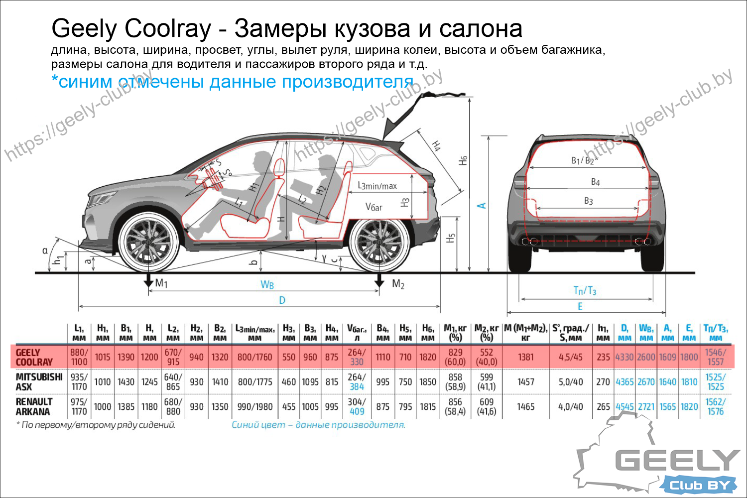 Габариты кузова, размеры салона Geely Coolray: длина, просвет, вылет руля, колея, высота и объем багажника и др.
