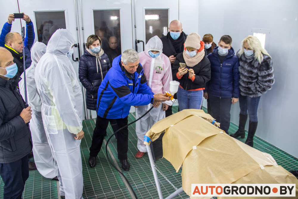 Наш разговор прервали организаторы: участников клуба позвали в современную покрасочную камеру, которую недавно установил гродненский дилер. Здесь будут проводить сертифицированные кузовные работы по автомобилям Geely. Посетителям дали возможность попробовать себя в качестве маляров.