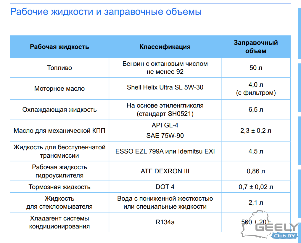 Рекомендуемые производителем рабочие жидкости и заправочные объемы Geely Emgrand 7 FE-3JC 2018-: