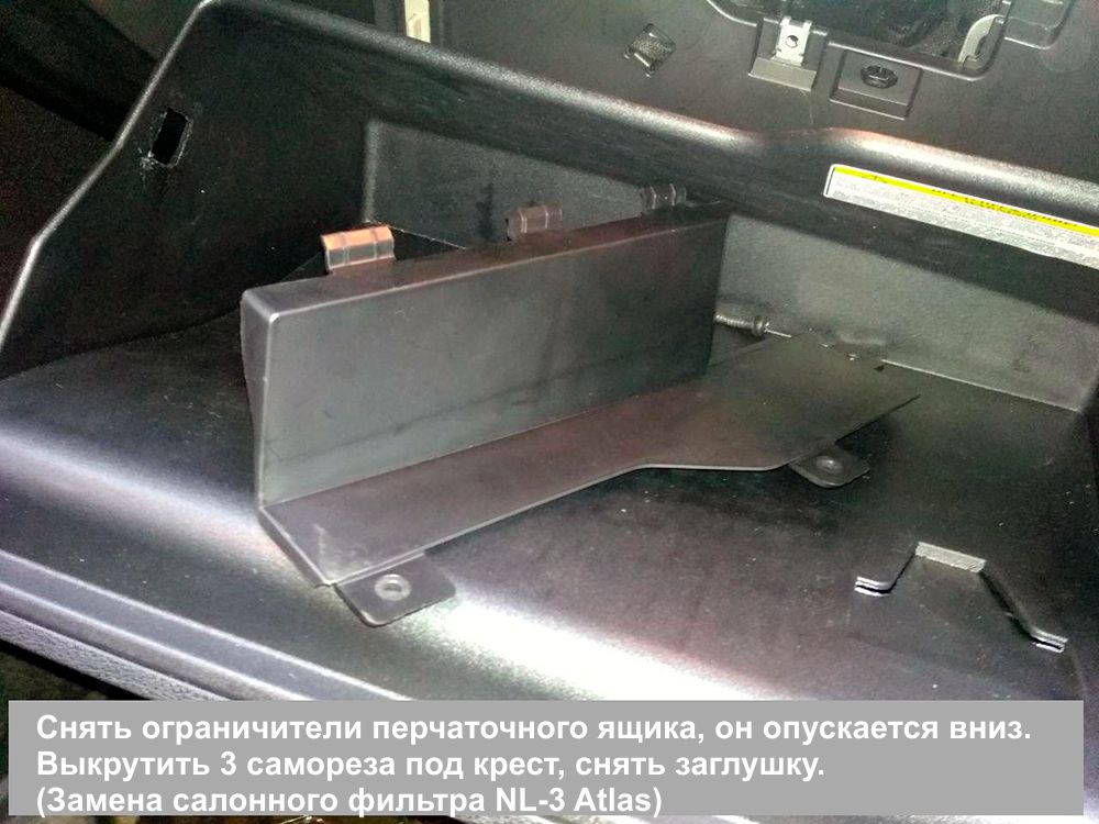 1) Снимаем ограничители перчаточного ящика, он опускается вниз. Выкручиваем 3 самореза под крест (PH), снимаем заглушку.