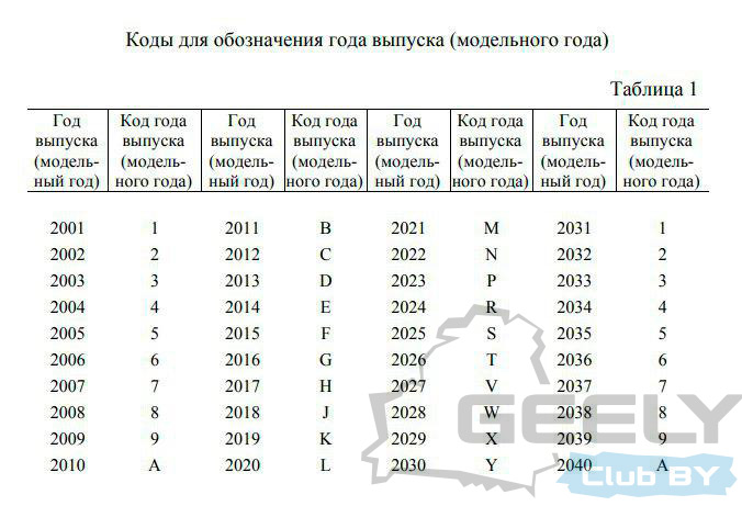 поз. 10: Код года выпуска (модельный год) согласно таблице 1 Приложения 7 к ТР ТС 018/2011;