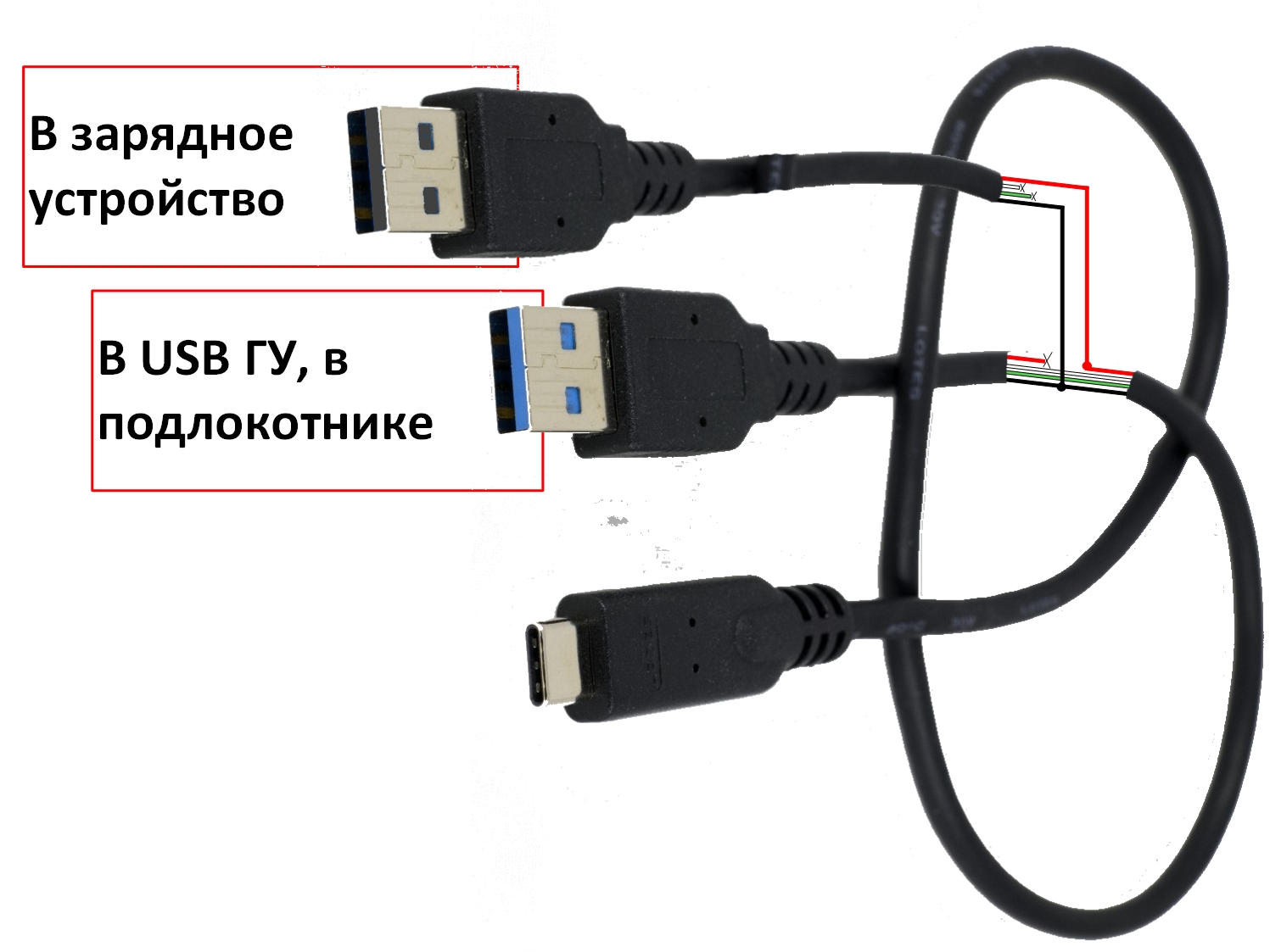 Через разъем ГУ телефон получает до 0,5А. Через родную зарядку в прикуривателе — телефон получает сколько ему надо. Решил проблему изготовление специального кабеля. К своему родному кабелю паяем дополнительный. По схеме. Телефон будет всегда заряжен, не зависимо от длительности использования в паре с ГУ.