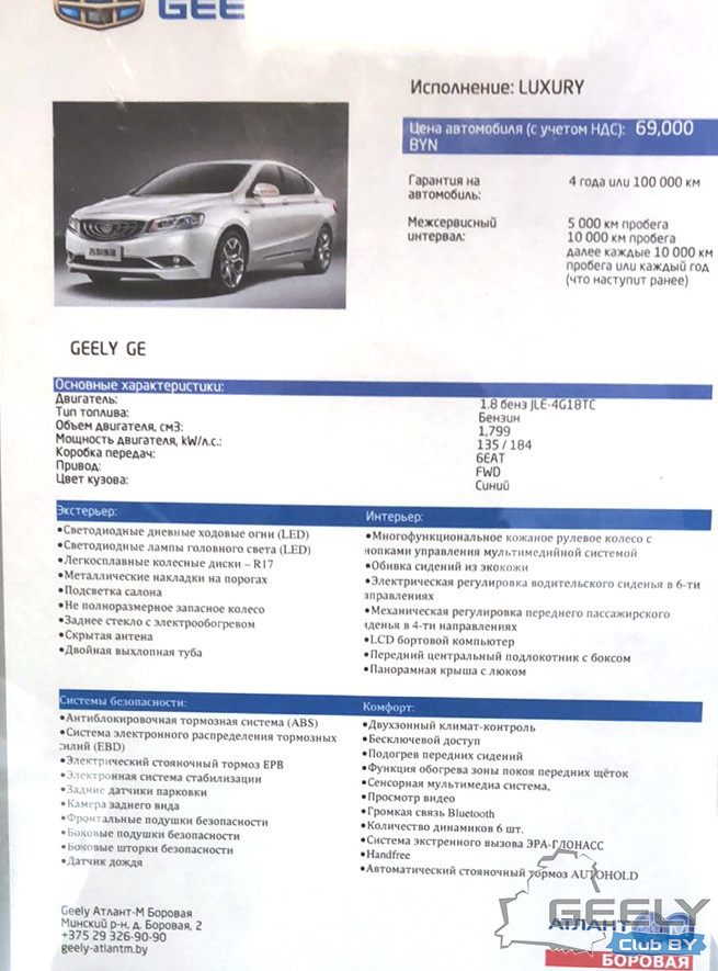 Geely GE появились в салонах белорусской дилерской сети пару месяцев назад с ценником 69000 BYN, который и ныне на той же отметке.